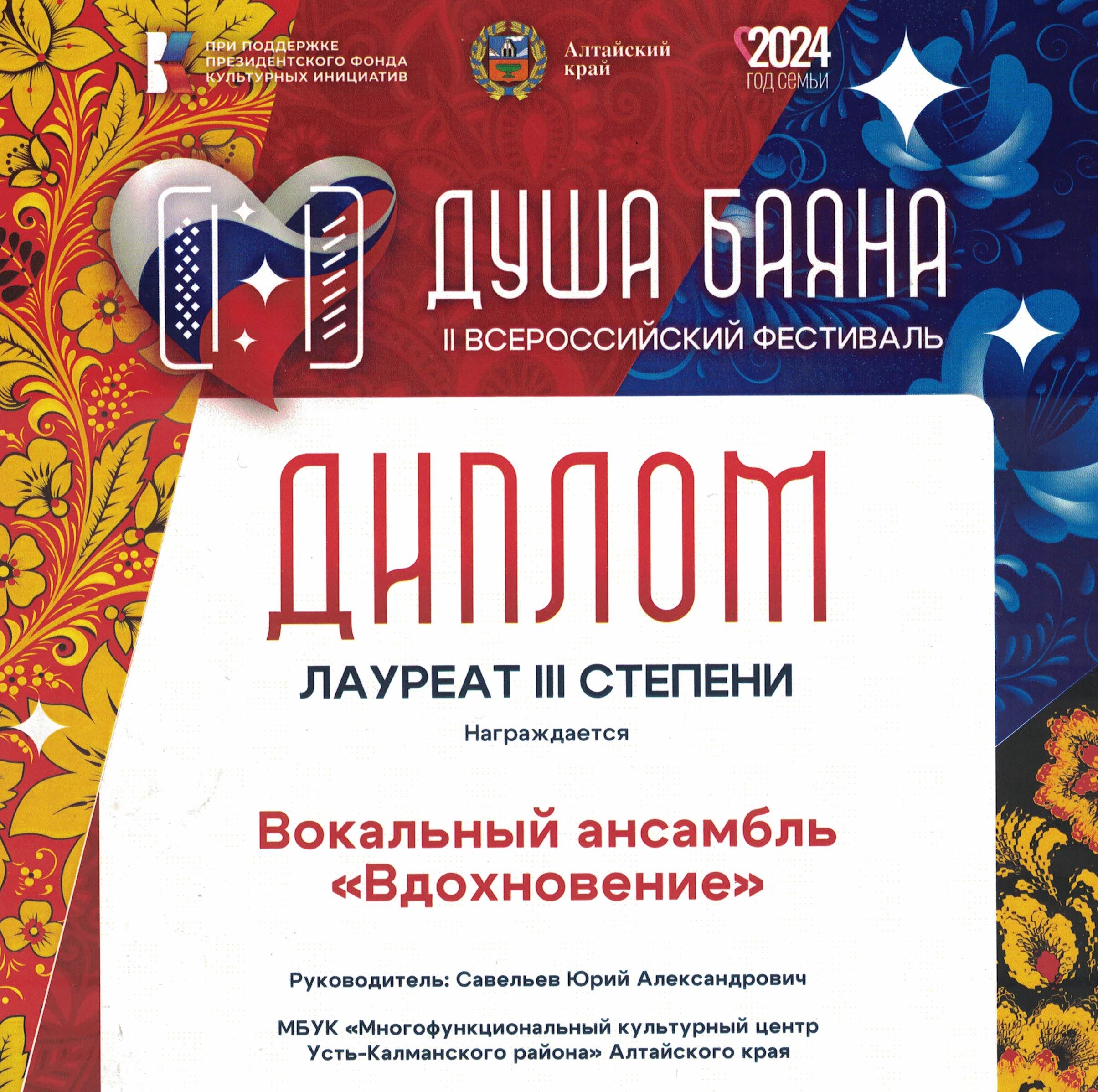 30 июля, вокальный ансамбль "Вдохновение" (рук. Юрий Савельев) принял участие в конкурсных прослушиваниях II Всероссийского фестиваля "Душа Баяна" (по Сибирскому федеральному округу). Конкурс прошел в Городском Дворце культуры г.Бийска. По итогам прослушивания коллектив приглашен для участия в Гала-концерте, удостоен памятной медали и Диплома Лауреата III степени.