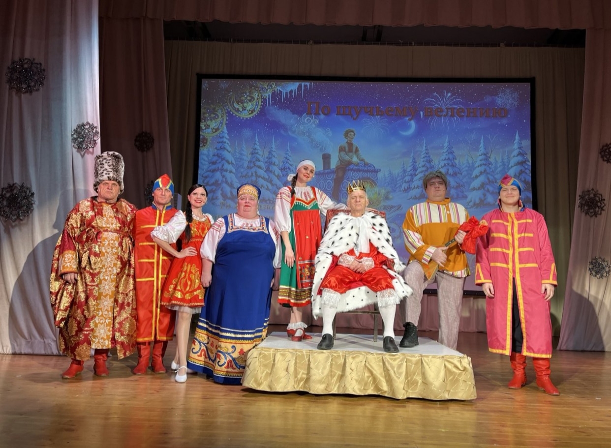Сказочное действо зрителю представили: Емеля - Евгений Сивин , Варенька - Анастасия Шаталова (Козловская), Клавдия - Анастасия Осинцева , Царь - Сергей Чуканов, Вельможа - Юрий Алпатов, Царевна Марфенька - Татьяна Полукарова , Стражники - Сергей Попов и Илья Нехорошков, маленькая Царевна - Ксюша Поломошина, Щука - Ирина Бельская , Ведра - Ксюша Поломошина и Влада Расторгуева, Дед Мороз - Фёдор Кабаков, Снегурочка - Анна Расторгуева.